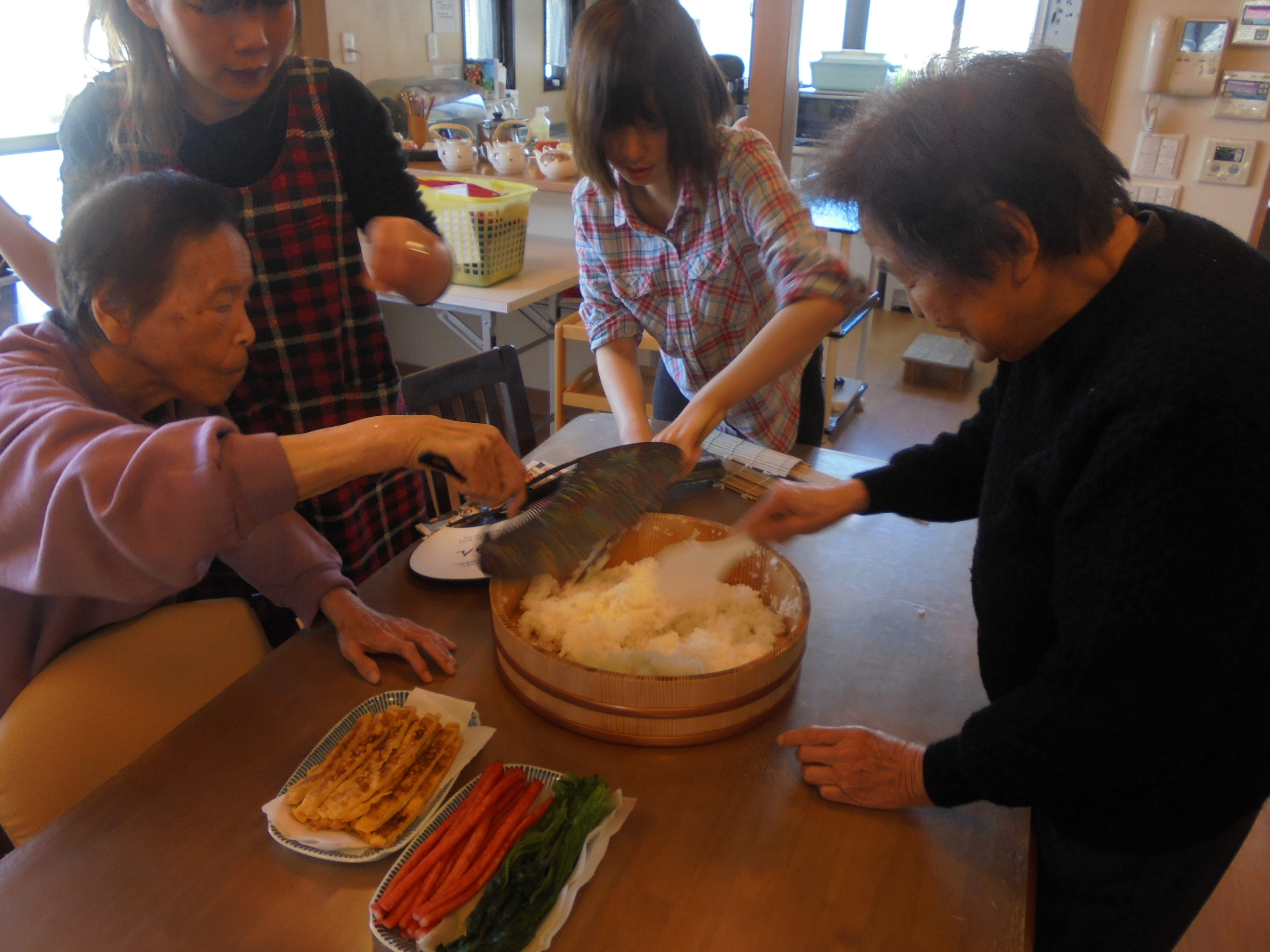 今日のお昼は、みなさんで、太巻きを作り、恵方向いて頂きました。