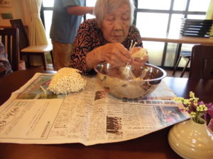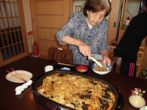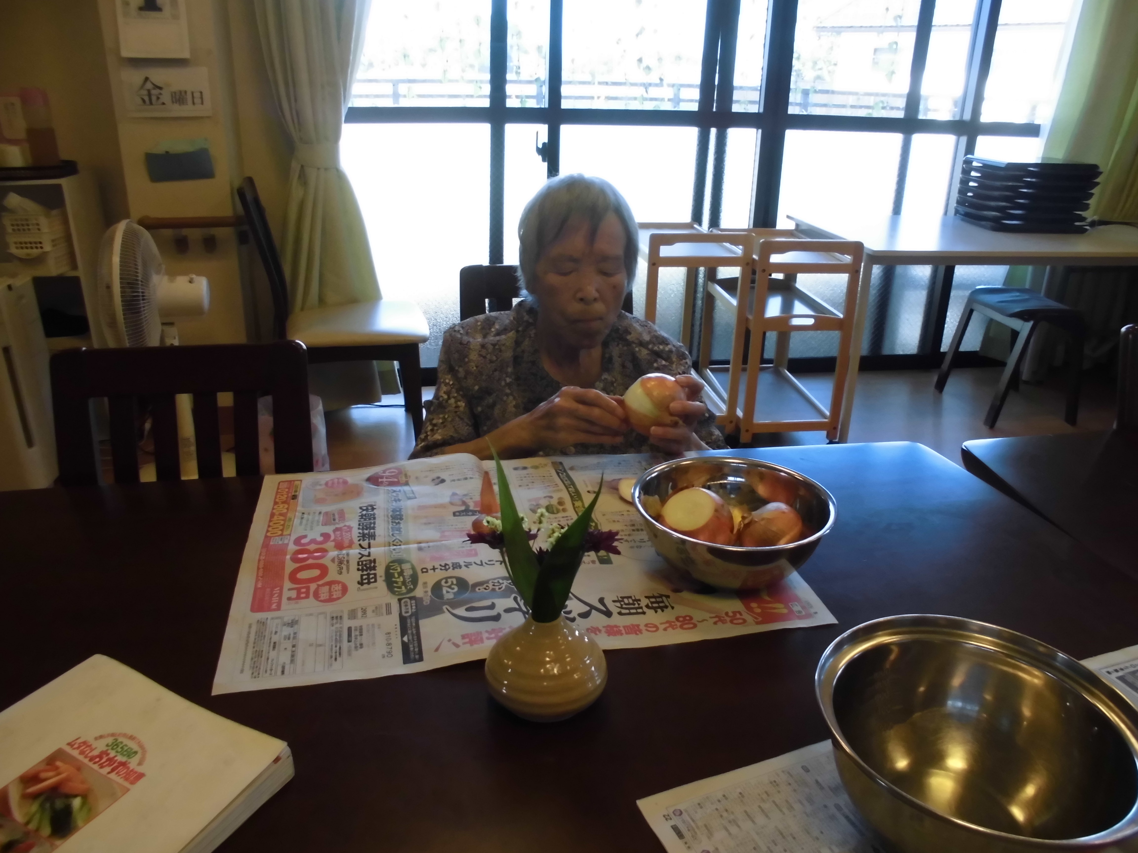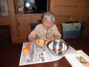 今日のお昼ご飯は焼きそばです。人参・玉ねぎ皮をむいてトントントン(●><●)