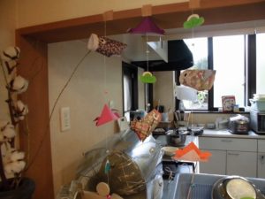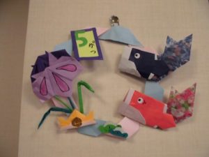 皆さんで折り紙で折られた鯉のぼりと兜を