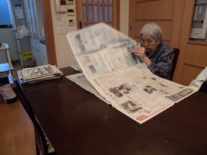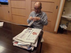 本日は新聞折りをお願いすると「ええで」と気持ちよく言ってくださいました。作業もすぐに覚えられ一生懸命に折られていました。