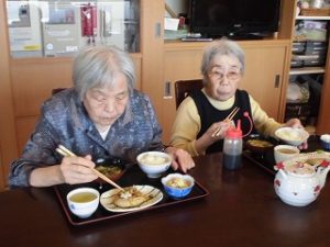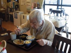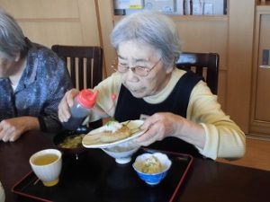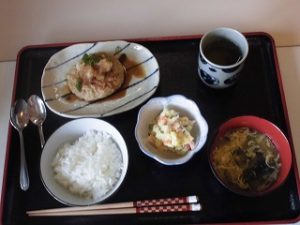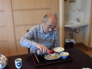 本日の昼食は和風ハンバーグでした。皆様自らドレッシングを調整して入れました。皆様「美味しい」と喜んでおられました。これからも美味しいものを沢山召し上がりましょうね。