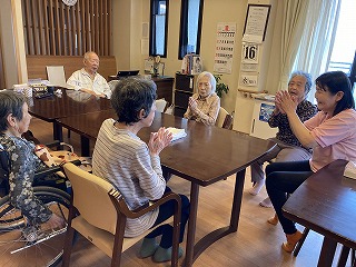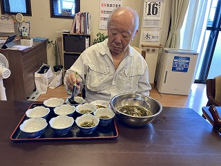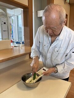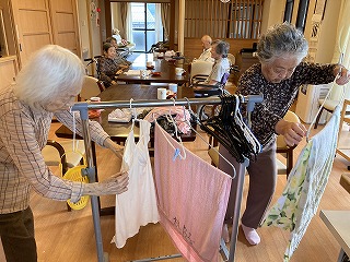 洗濯物干しをされています。食事の準備を慣れた手つきでされています。。皆さんできる事をされています。