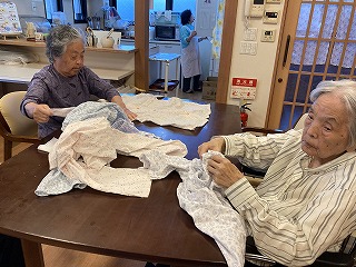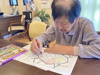 上手にぬり絵をされています。洗濯物畳みなど毎日してくださいます。職員より丁寧に、上手にしあげてください