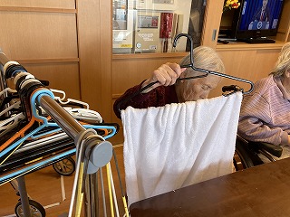 食事の準備、しょくじふうけいです。洗濯物たたみ、新聞折りをされています。できることを