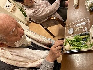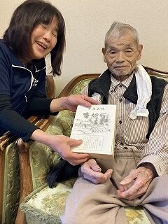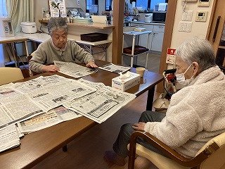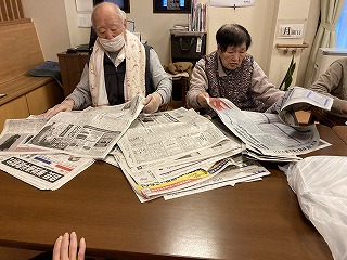 新聞折りをされています。差し入れで頂いた糸切り餅に笑顔で一枚。