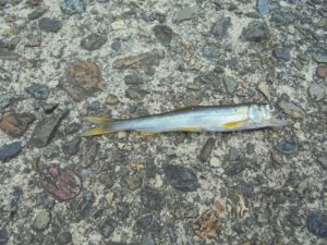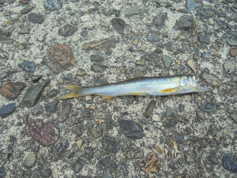 散歩の途中の川でお魚を見つめました。