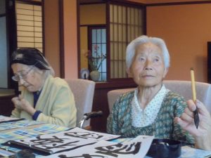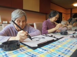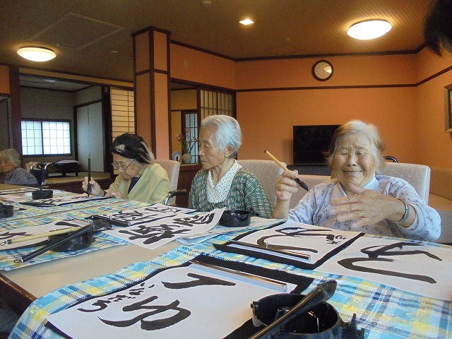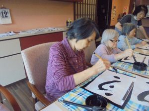 皆さんと一緒に書道クラブを行い、『心』や『梅雨』という字を書きました。