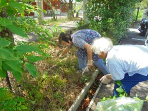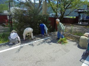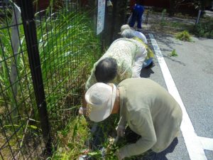 今日はまだ涼しいうちに駐車場の草刈りを皆で行いました。