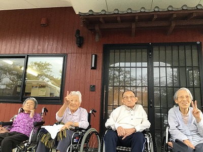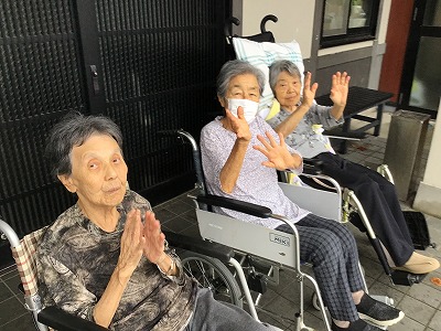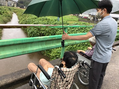 皆様と傘をさし散歩をしたり玄関前にでて外の空気を吸ったり