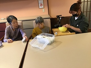 ケーキ作りも皆さん協力して作りました。フルーツも沢山入っており贅沢ですね。