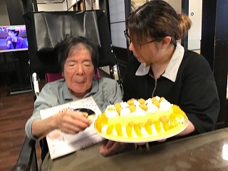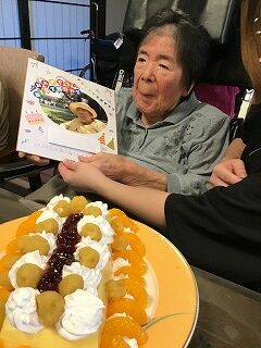 お誕生日のご利用者様をケーキと色紙でお祝いしました。