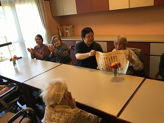 お誕生日はもうちょっと先なのですが、利用者様で集まりお祝いをさせて頂きました。