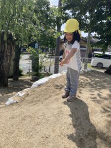 ワンちゃんバスにお友達と乗ってはユラユラ~と揺れたり、大きな砂のお山を足腰を使って登ったり下りたりして楽しませて頂きました♡良いお天気でしたが、みんなでお茶休憩をしてほっこり…❤