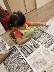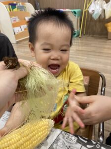 皮をめくっていくうちに、みんなの知っている黄色い顔が見えてくると、「コーンやー!😆」と嬉しそうに先生に伝えてくれる姿がありました。
