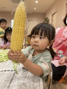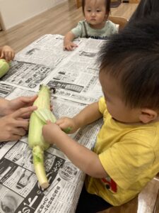 7月、8月と食育でトウモロコシの皮むきをしました🌽