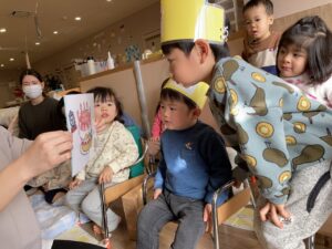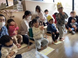 先生のお楽しみは…乗り物クイズ🎵何が出るかな?と乗り物が出てきてみんな「しんかんせん!」など答えて喜んでくれていました(o^―^o)