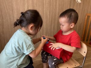 時には、赤ちゃんのお母さんになり「ちょっと~、ねつはないんですけど~、はなみずがでるんです~」や「きょうは〇〇時にむかえにきま~す!」と保育園ごっこが始まったり…思わずクスッと可愛くてほほえましい姿があります。