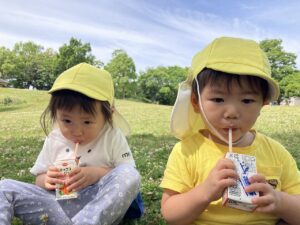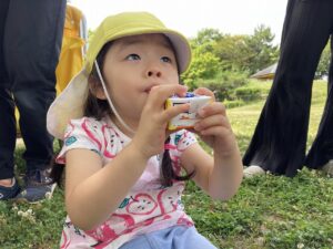 みんなのお楽しみは…いつもは園で食べるおやつを、お空の下でみんなで食べる事です❤