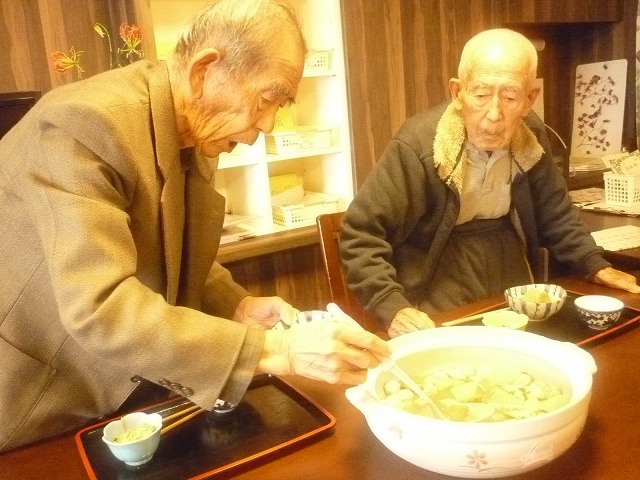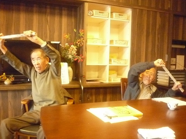 女性の方と一緒に、脳トレや棒体操、食事の取り分け、