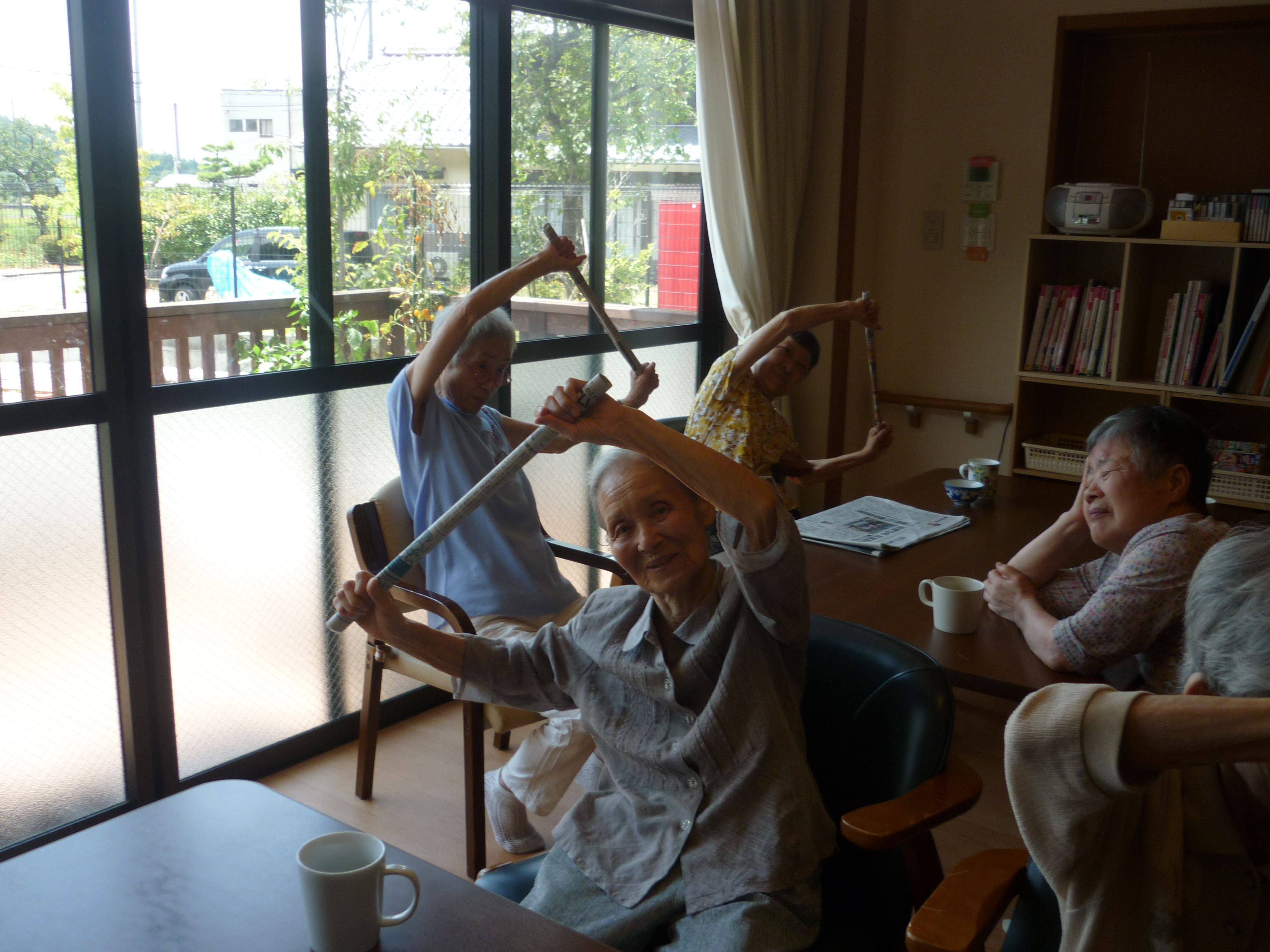 新聞紙をくるくると棒状に巻き、それを使い体幹の曲げ伸ばしやねじりを行います。