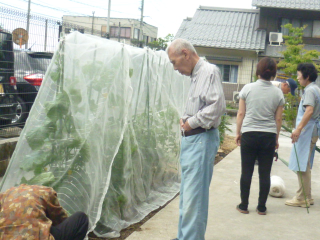 体操をされ、午後からは作物にネットをかけてくださいました。
