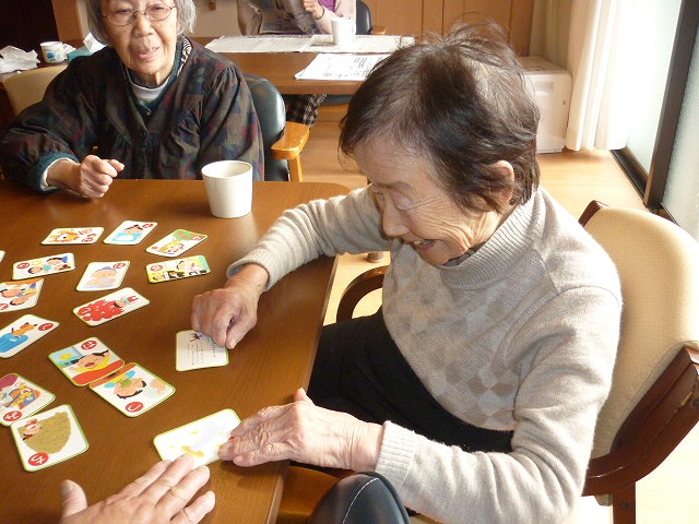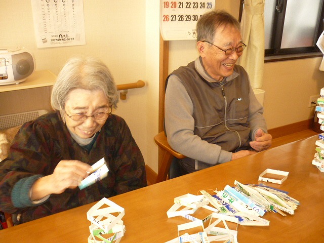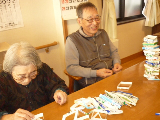 かるたや牛乳パックの積み上げのレクレーションを