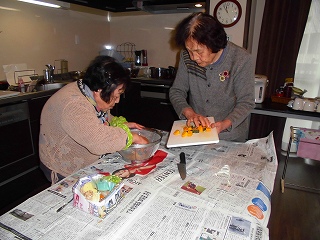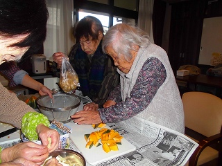グループホームの利用者さんと一緒に昼食のおみそ汁の具を切って下さいました。