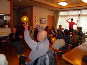 昼食前の体操。本日はボール体操です。