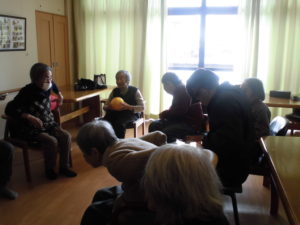 ボールを体の周りで回したり。隣の人から回ってきたボールを受け取ったり。