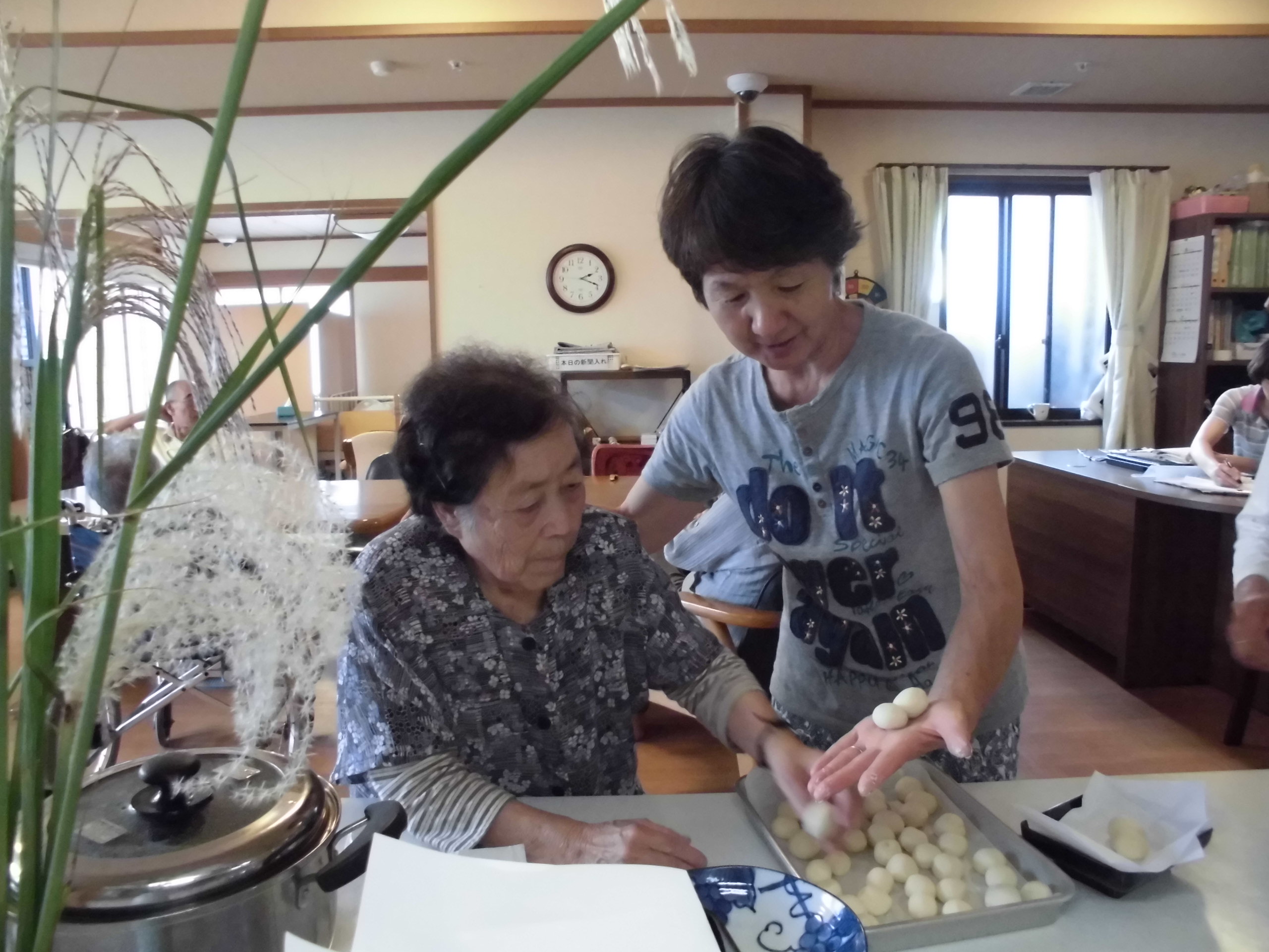 お月見のだんごを作ってススキを飾ってお月見気分を楽しみました。雲に隠れてはっきりとは