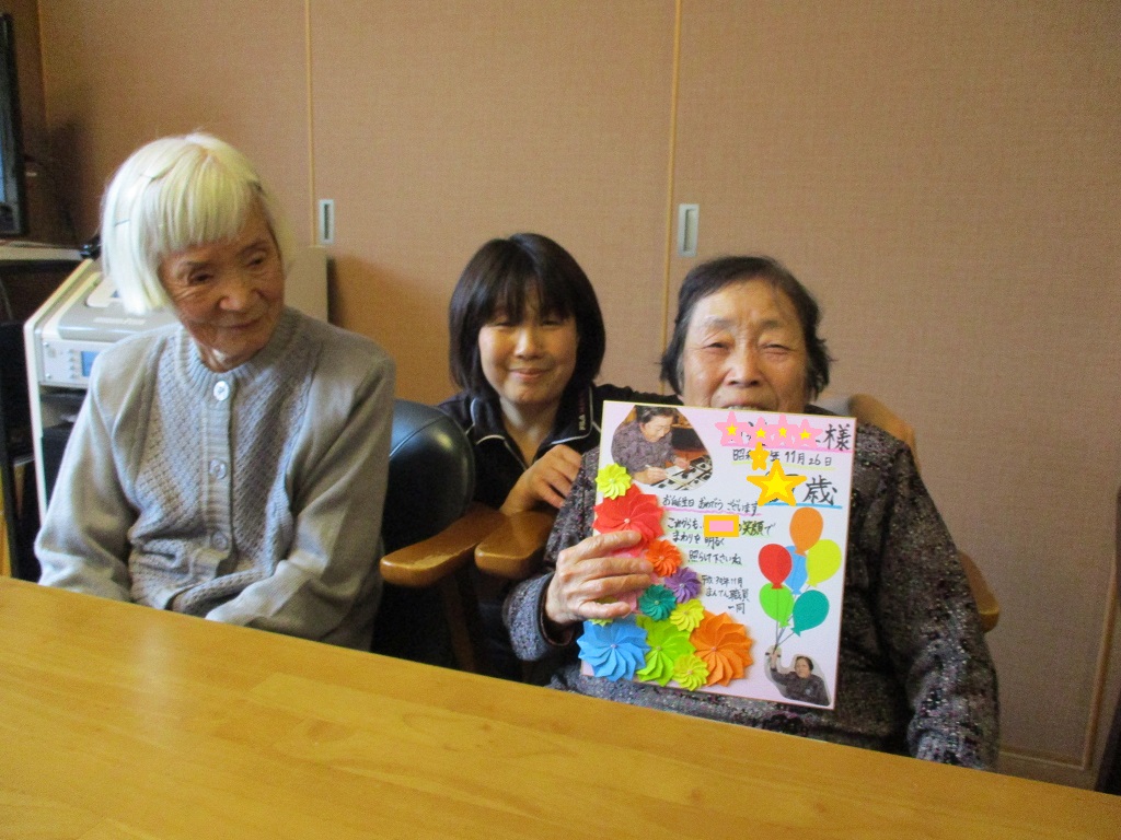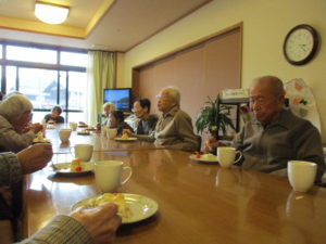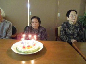 今日は11月生まれの利用者さんの誕生日のお祝いをしました。皆さんでケーキを食べながら