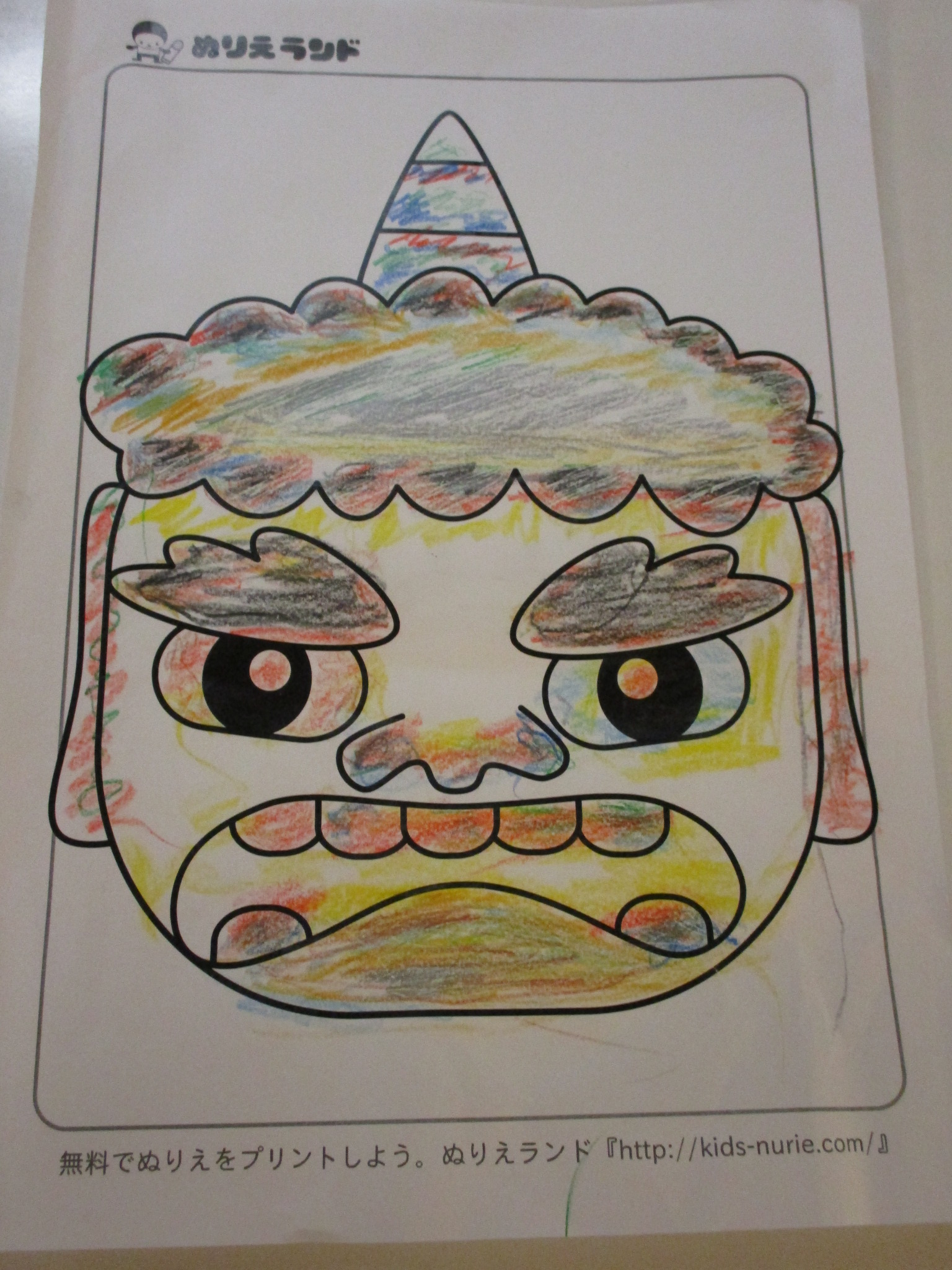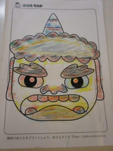 今日は節分に使う鬼の絵に塗り絵をしました。色々な色で塗り素敵に仕上がりました。 椿姫。