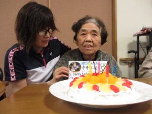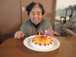今日は利用者さんの誕生日会をしました。果物がいっぱいのっている美味しいケーキで