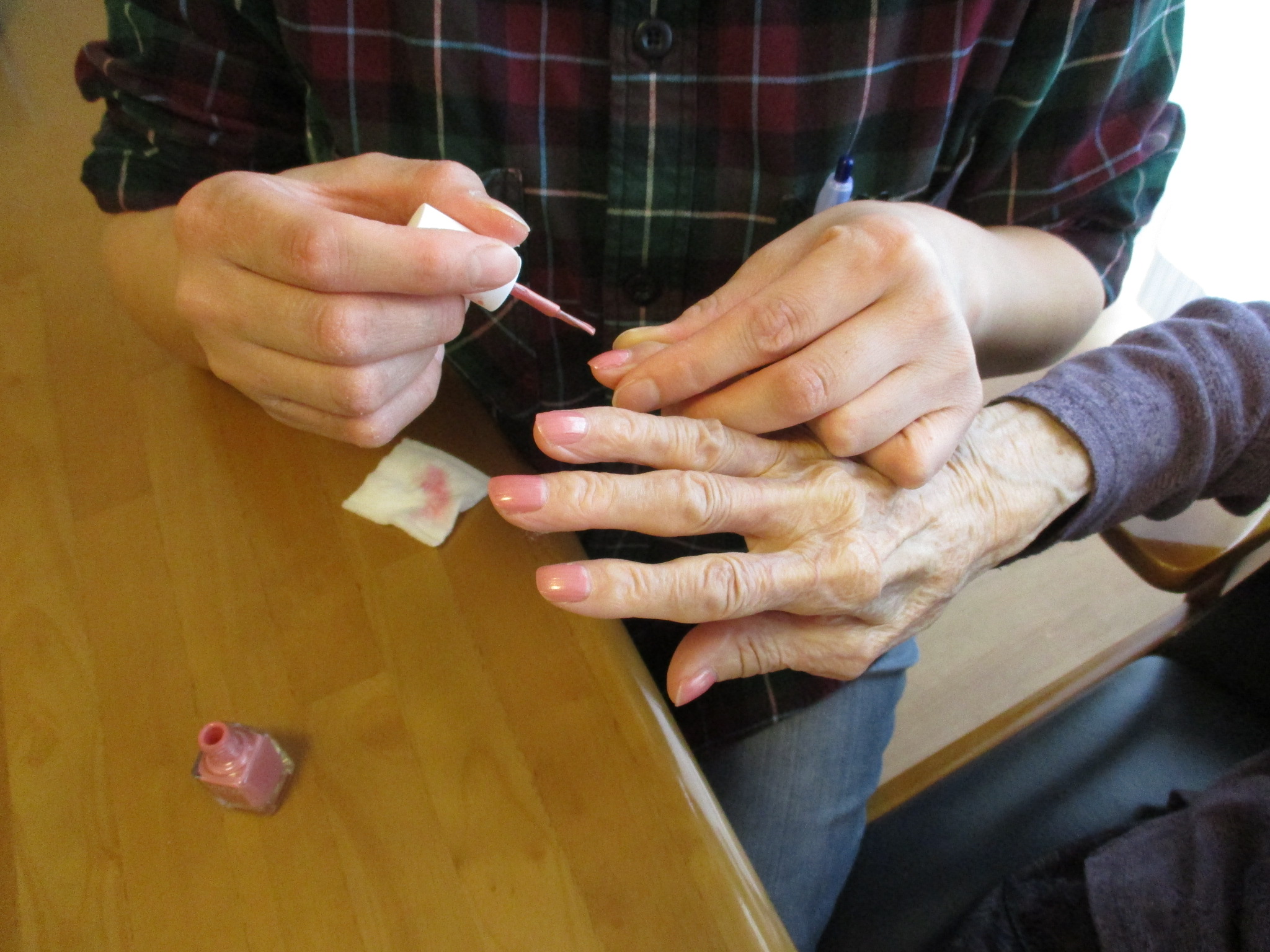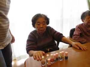 職員にマニキュアを塗ってもらいおしゃれを楽しみました。色とりどりのネイルで