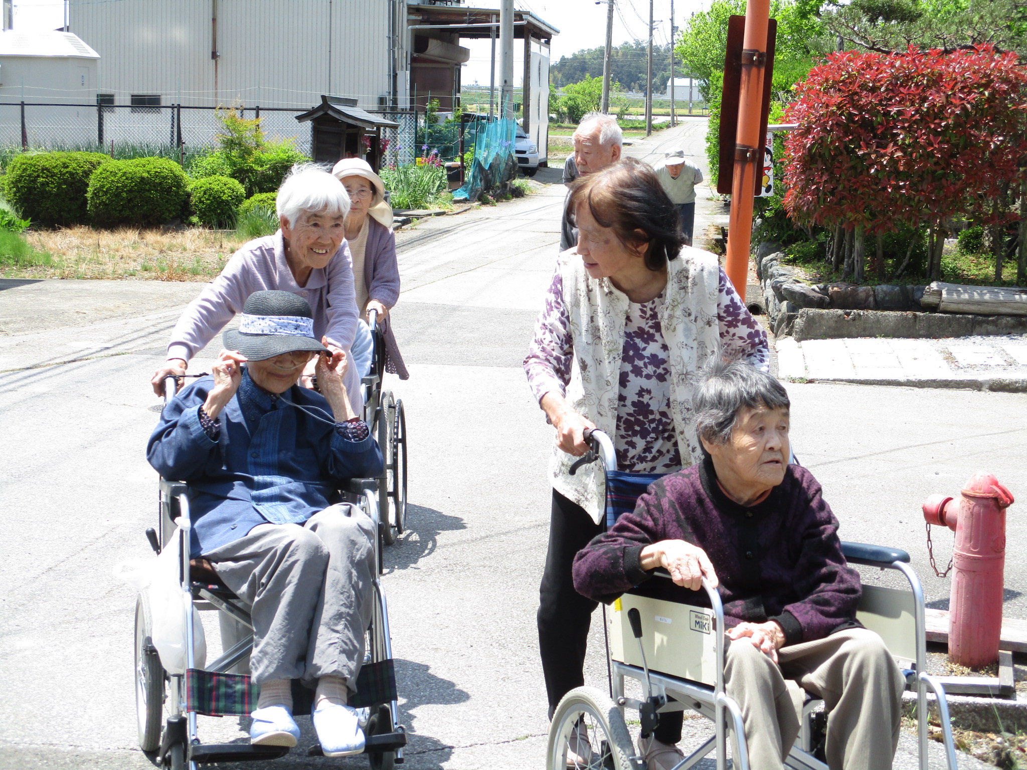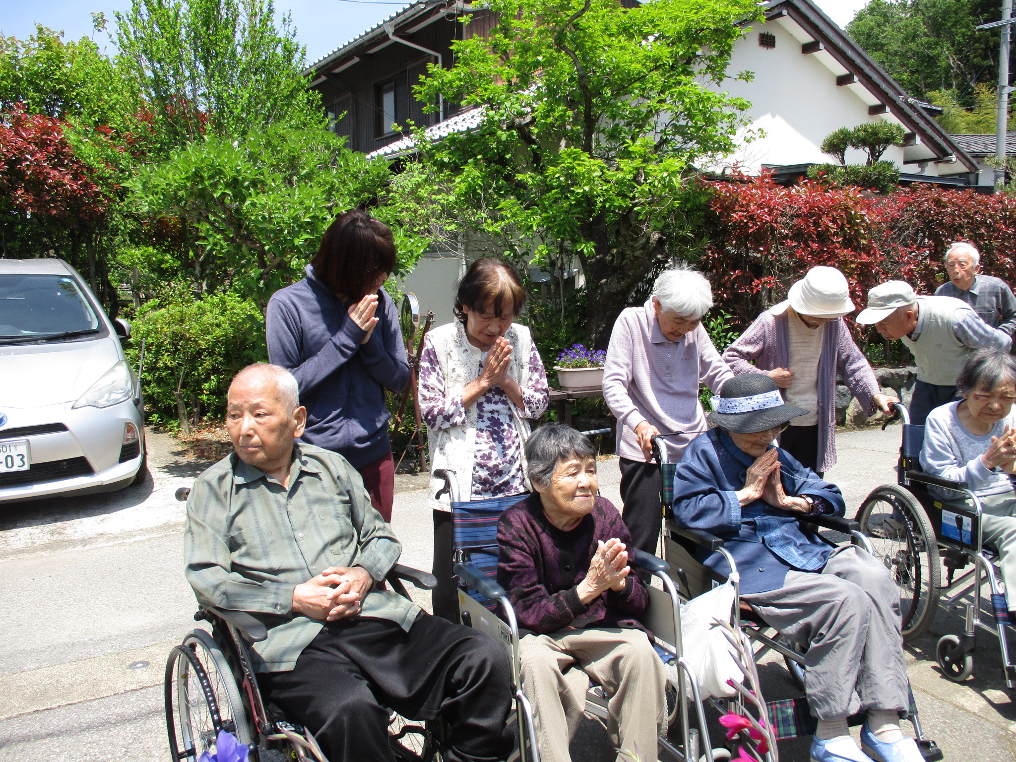 歩ける方は車椅子を押され足が痛い方は車椅子に乗って近くの地蔵さままで散歩に行きました。