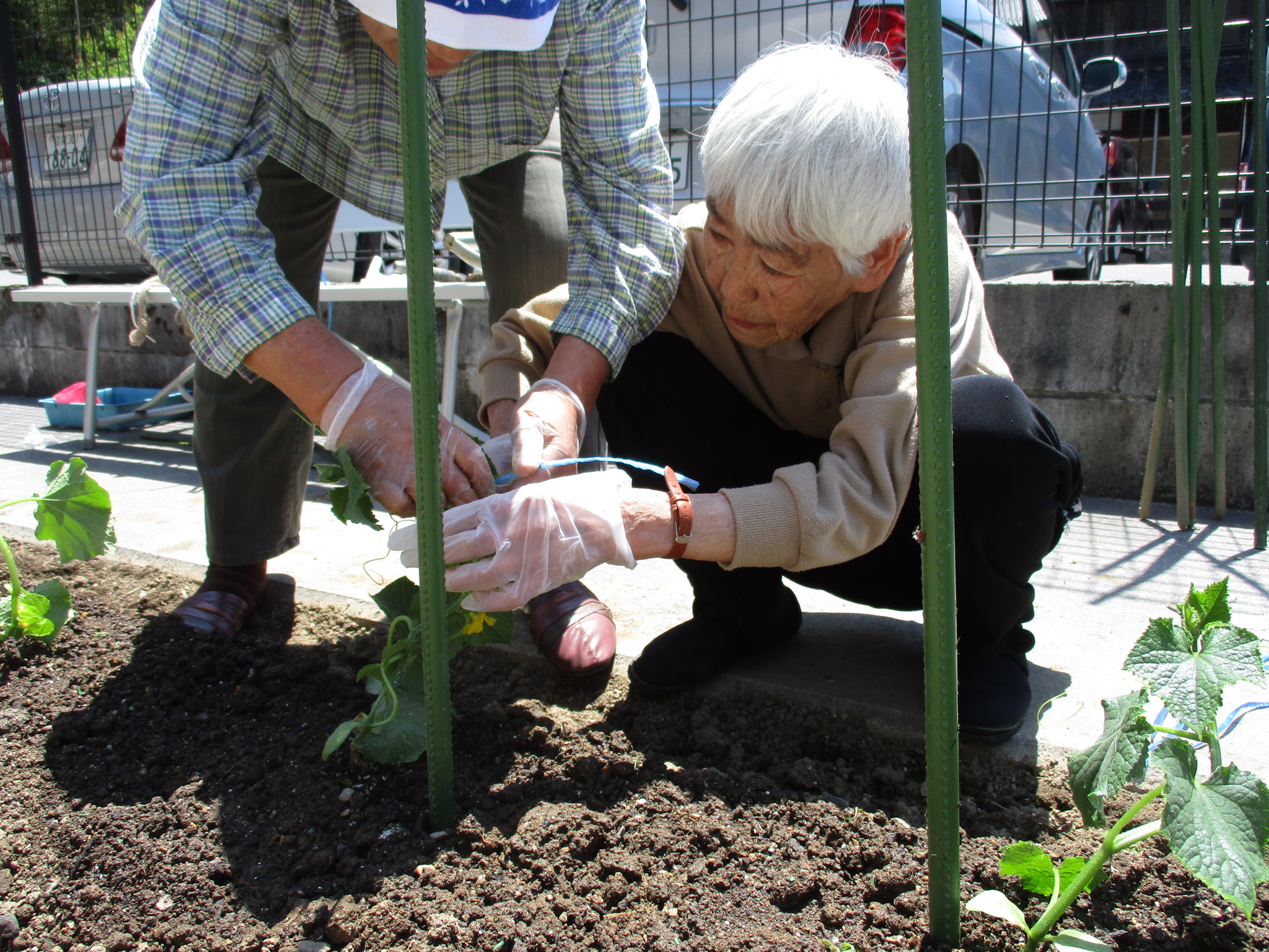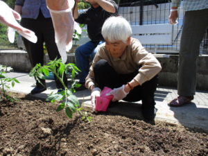 皆さんで協力されて畑に(きゅうり)や(とまと)等の夏野菜を植える作業をしました。