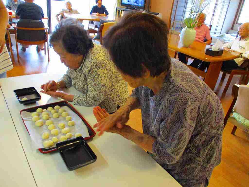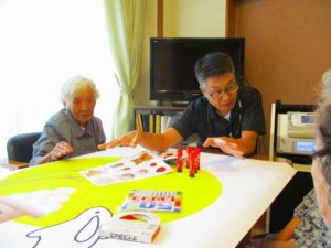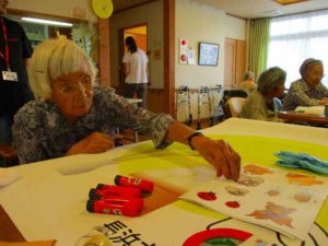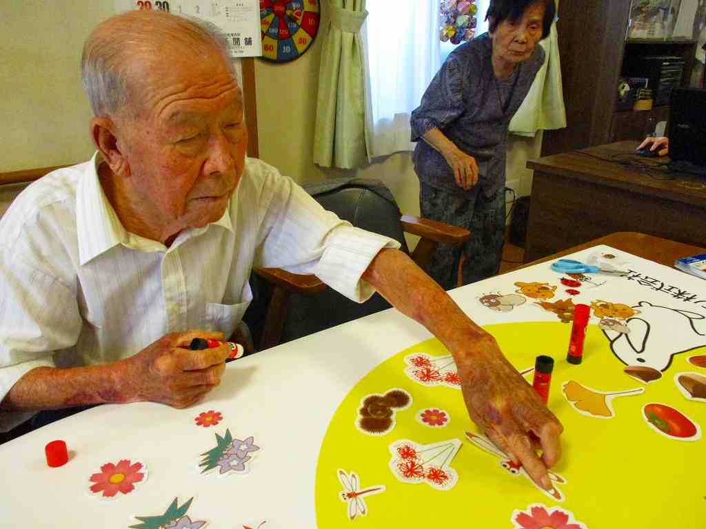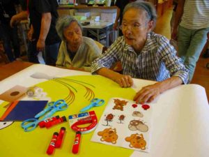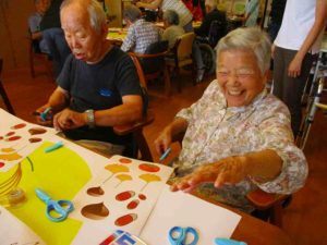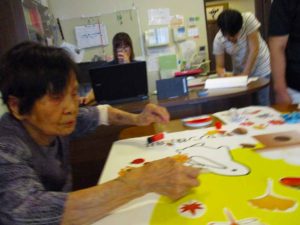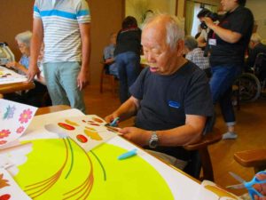 一生懸命にハサミで絵を切り抜き用紙に貼っておられます。