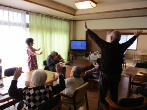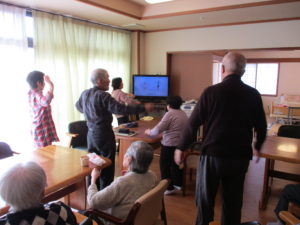 今日は、皆さんで体を動かして体操をしました。腕を上げたり、曲げたりと、健康維持の