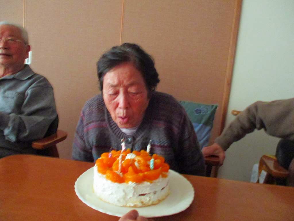 ケーキでお祝いしてろうそくの火を消して