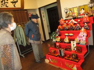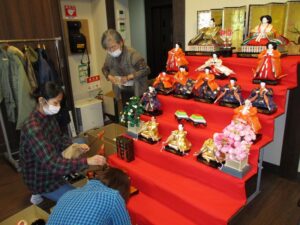 今日は雪がたくさん降りましたが、春はもうすぐです。皆さんで雛壇の飾りつけを行いました。