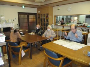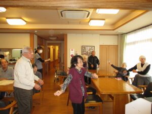 音楽に合わせ、お互いに声かけあって体操を。