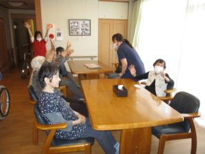 最近は、ラジオ体操と共に肩の体操をしていただいています。
