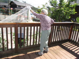 先週は、お猿さんに少しとられてしまいましたので、しっかりネットを張りました。
