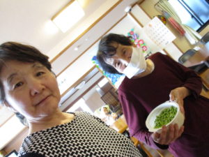 今日も豆を収穫しました。たくさんとれたので、お昼は豆ごはんにしました。