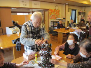 松ぼっくりでクリスマスツリーを作りました。皆さん、飾りつけを熱心に