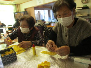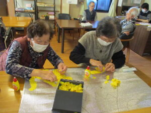 今日は新年1月の壁飾りを作り始めました。フェルトを細かく切って貼り絵にします。