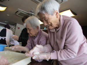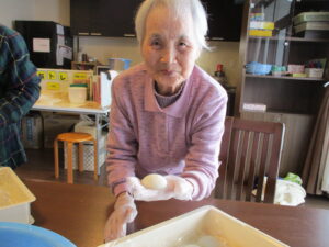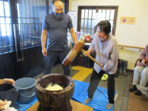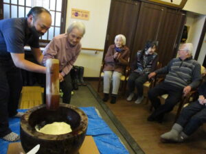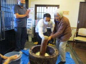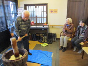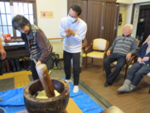 今日はお正月用のお餅つきをしました。皆さん、元気に杵をふるってくださいました。