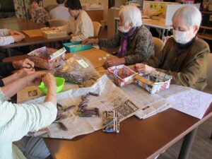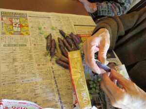 ご利用者様と豆をむきました。