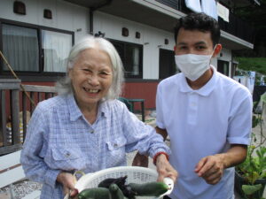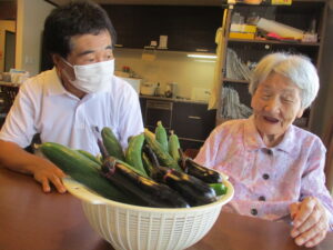 畑で今日も沢山の野菜が穫れました。きゅうりの大きなこと!