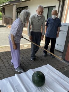 収穫したスイカでスイカ割をしました😊